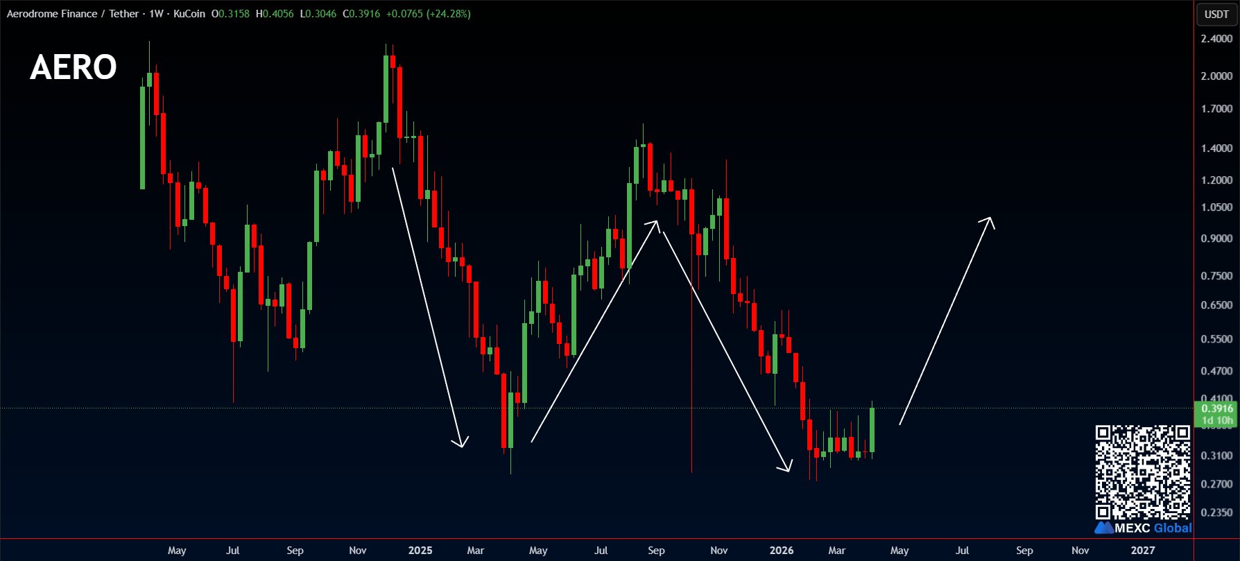 AERO在0.39美元关键支撑位积累,等待突破后买入。