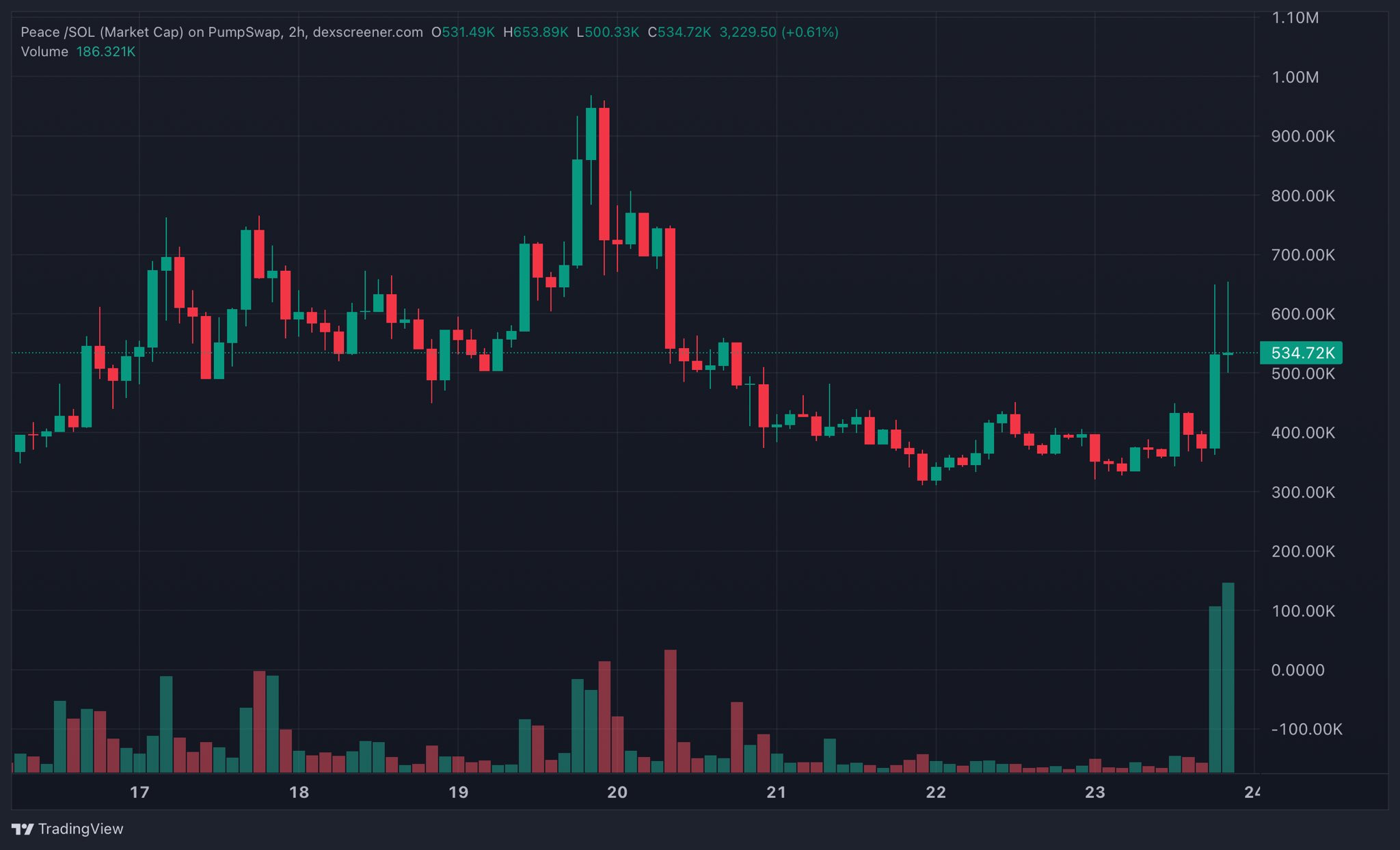 The PEACE token is performing strongly on the Solana chain, with price and volume surging and clear inflows of capital.