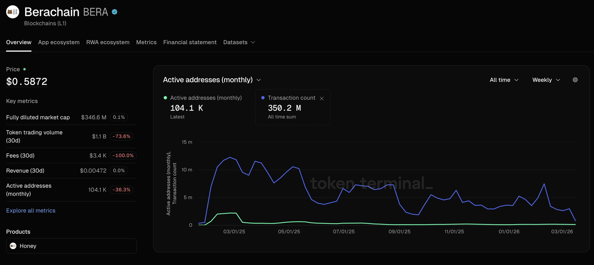 Berachain’s valuation fell from $1.5B to $310M, with on-chain key metrics sharply declining.