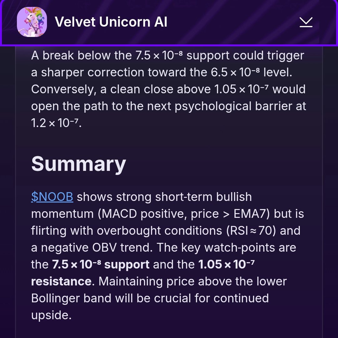 Saw this coin called NOOB, and I decided to check if out with velvet, and velvet did a comprehensive analysis of this coin with it's unicorn AI.