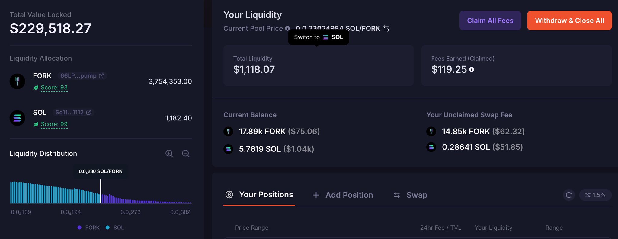 The author is bullish on FORK, continuing to hold despite slowing rewards due to good Fibonacci and liquidity support.