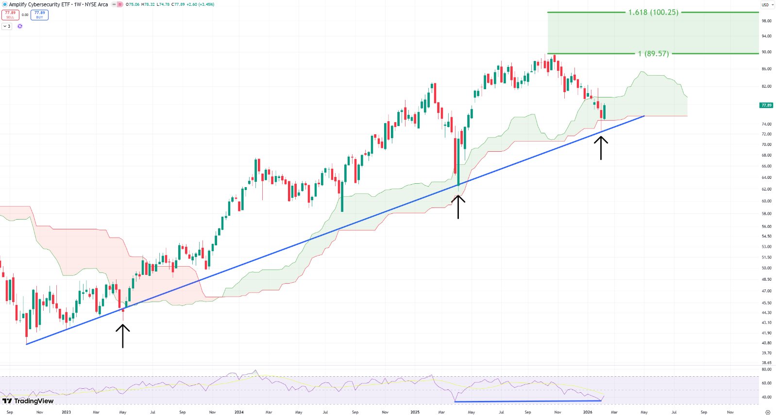 HACK has touched the long‑term uptrend support line and rebounded; the technical outlook is bullish with a target of $100.25.