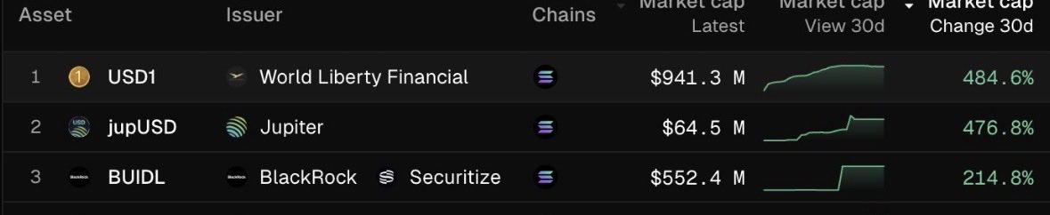 🏦⛓️ @JupiterExchange's jupUSD stablecoin is the fastest growing tokenized asset on @solana, with market cap up +27.4% over the past month.