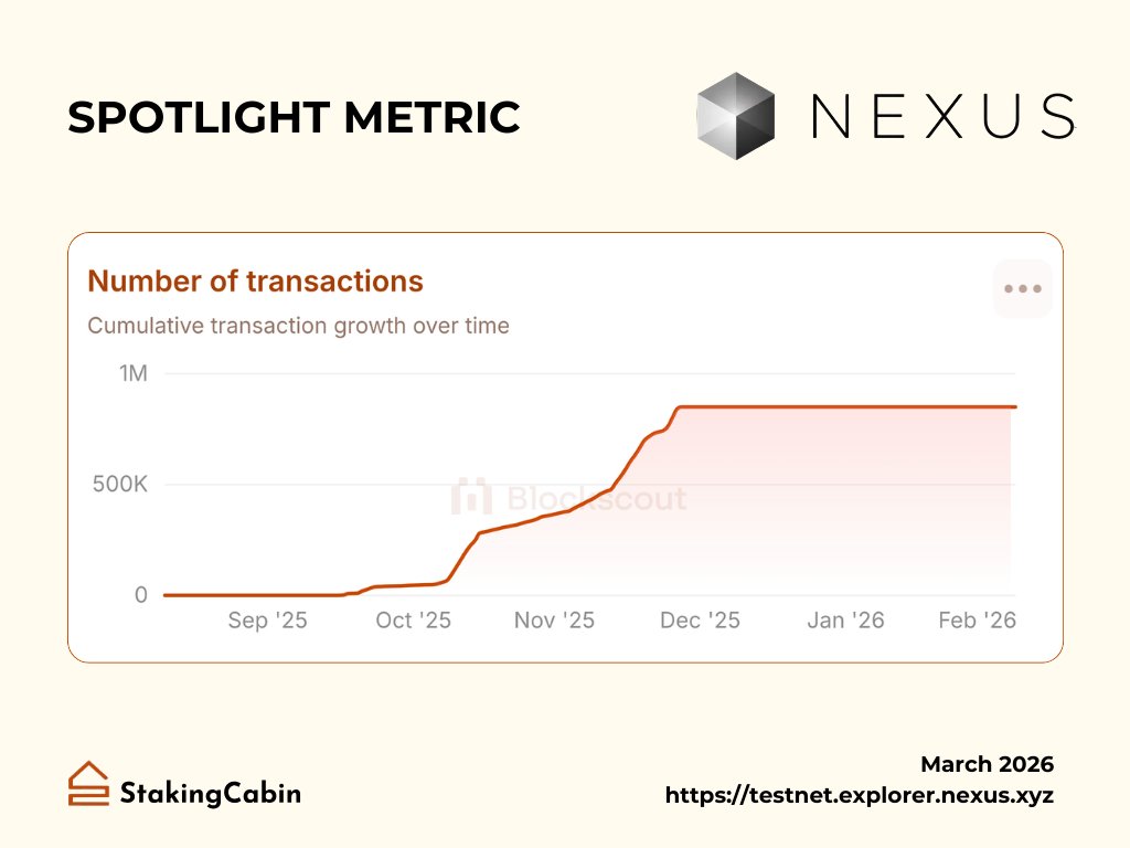 Nexus scaled from 0 to 850K cumulative transactions on testnet in 90 days, with the sharpest acceleration in November, when adoption flipped from linear to exponential.