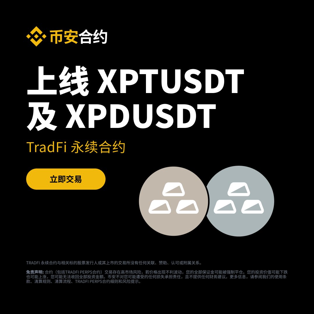 Binance Futures will launch XPTUSDT and XPDUSDT perpetual contracts on January 30, 2026 at 18:00 and 18:15 (UTC+8).