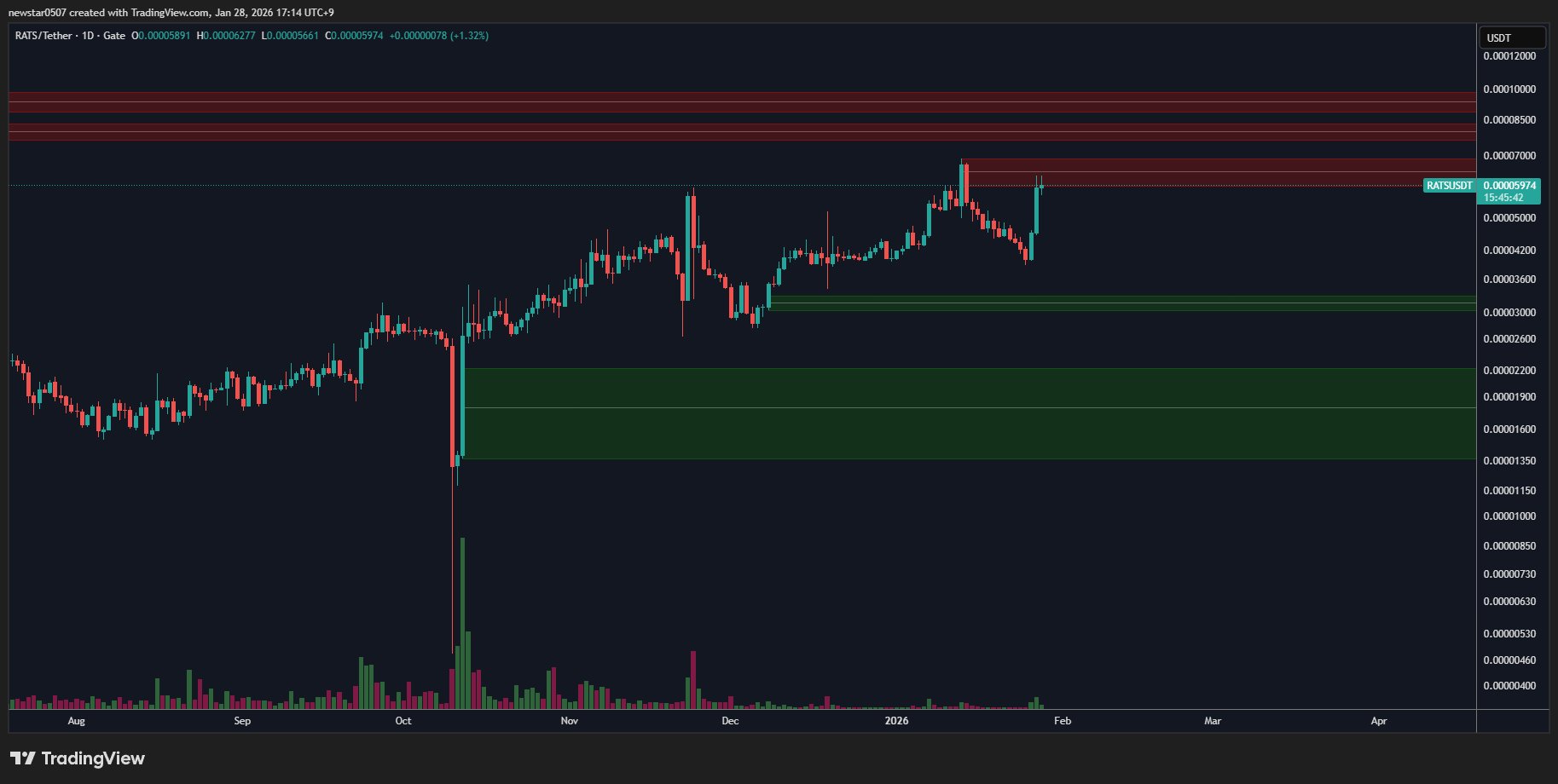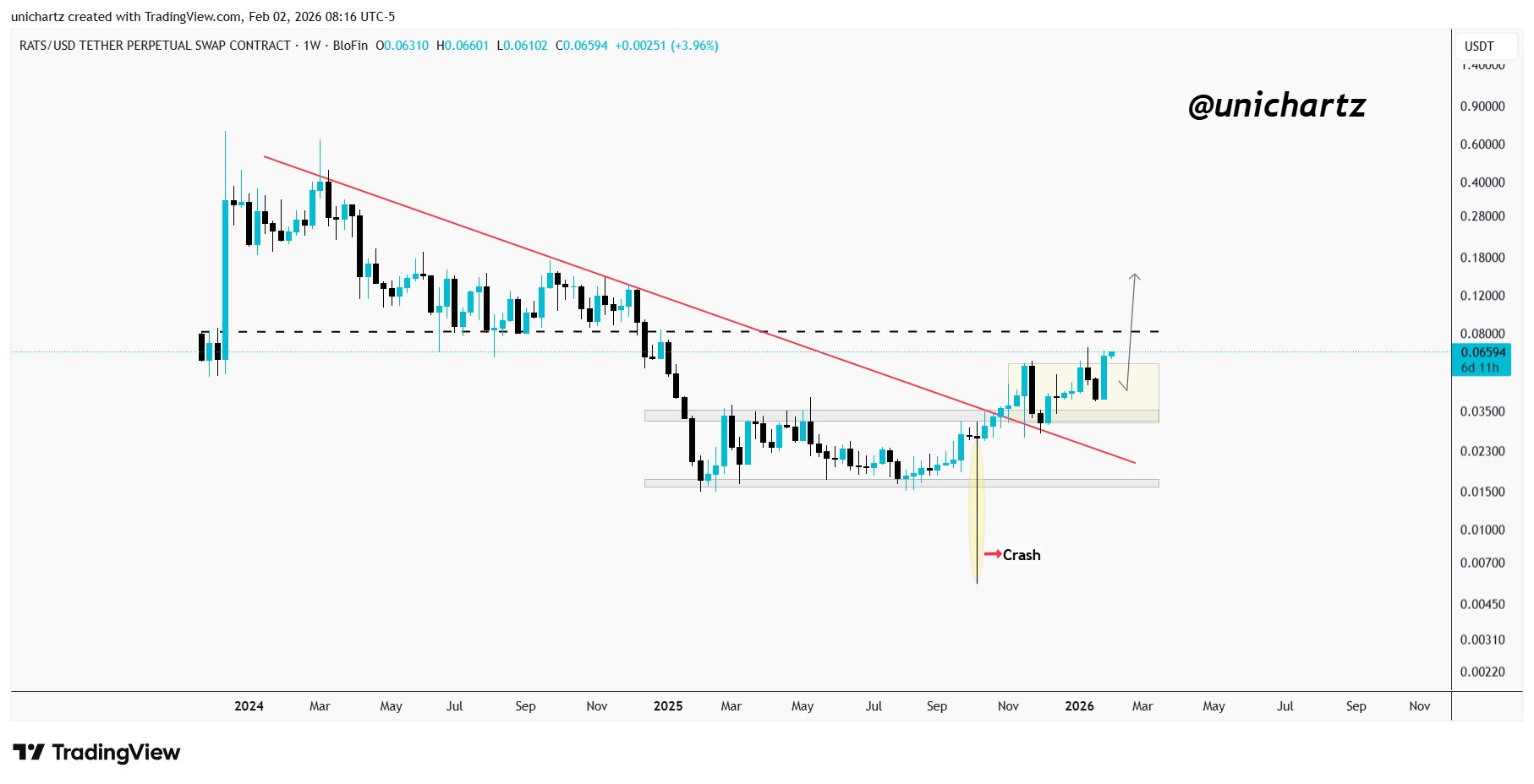While the broader market is bleeding, $RATS is showing relative strength. Price has broken above the long-term downtrend line and is holding above a key support zone, indicating strong buyer interest.