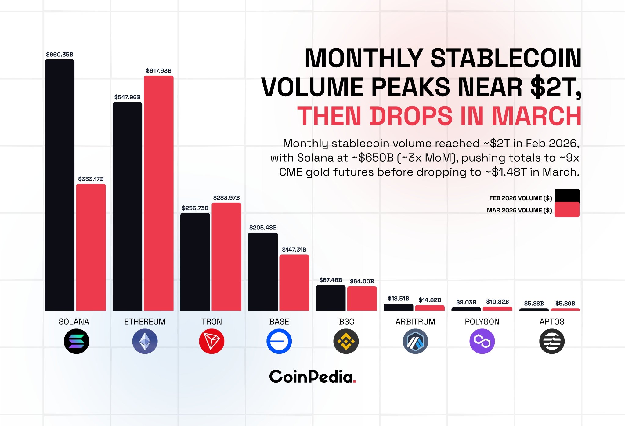 Stablecoin monthly trading volume reached $2 trillion in February, dropped to $1.48 trillion in March, with Solana contributing the most.