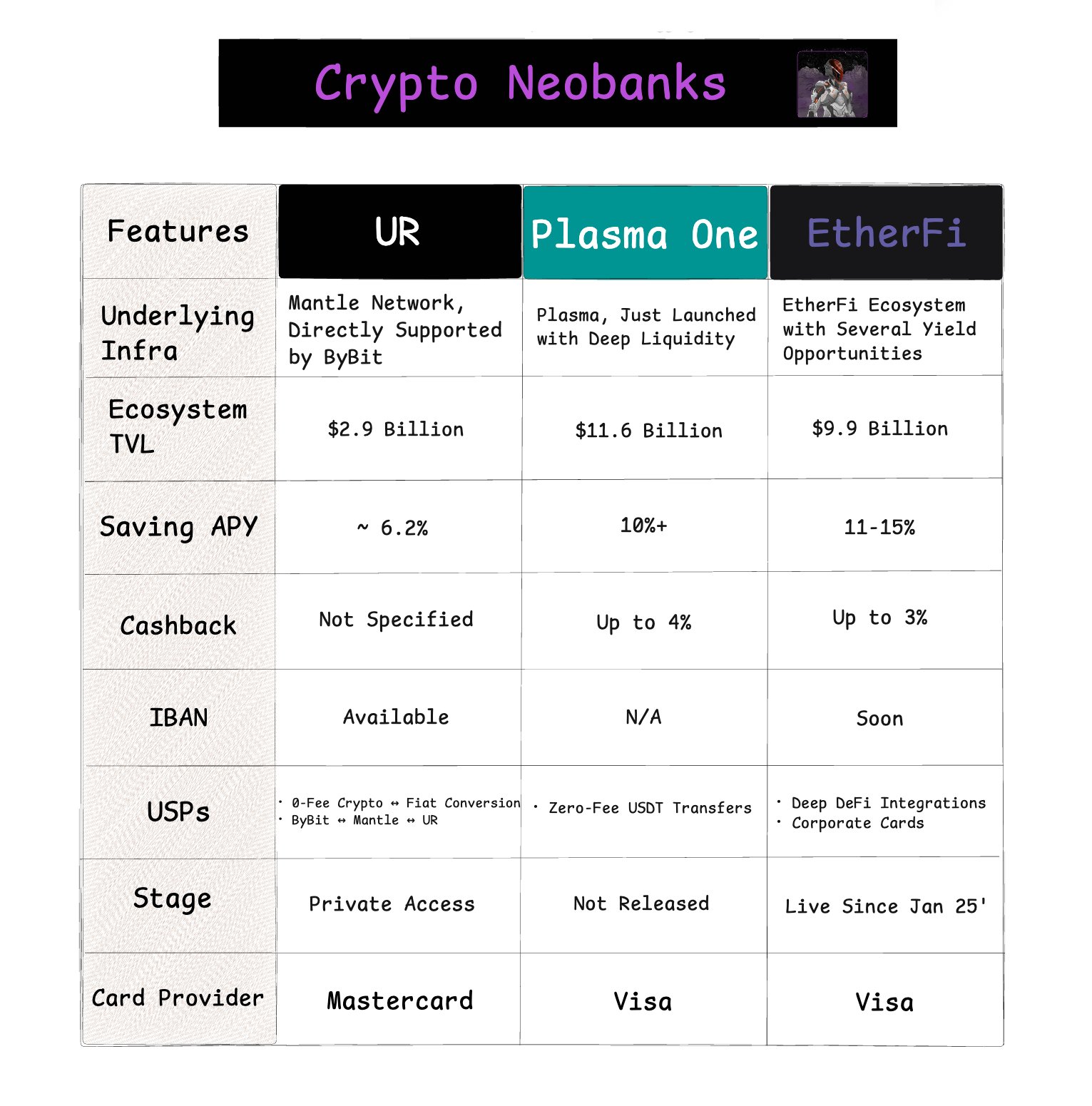 Predicts that 2025 will be the breakout year for crypto neobanks, comparing key metrics of projects like UR, Plasma One, and EtherFi.