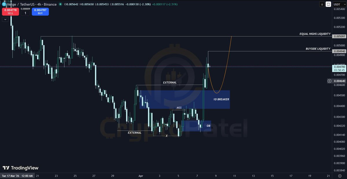XVG shows strong bullish continuation, expected to break to $0.005097 after a retracement.