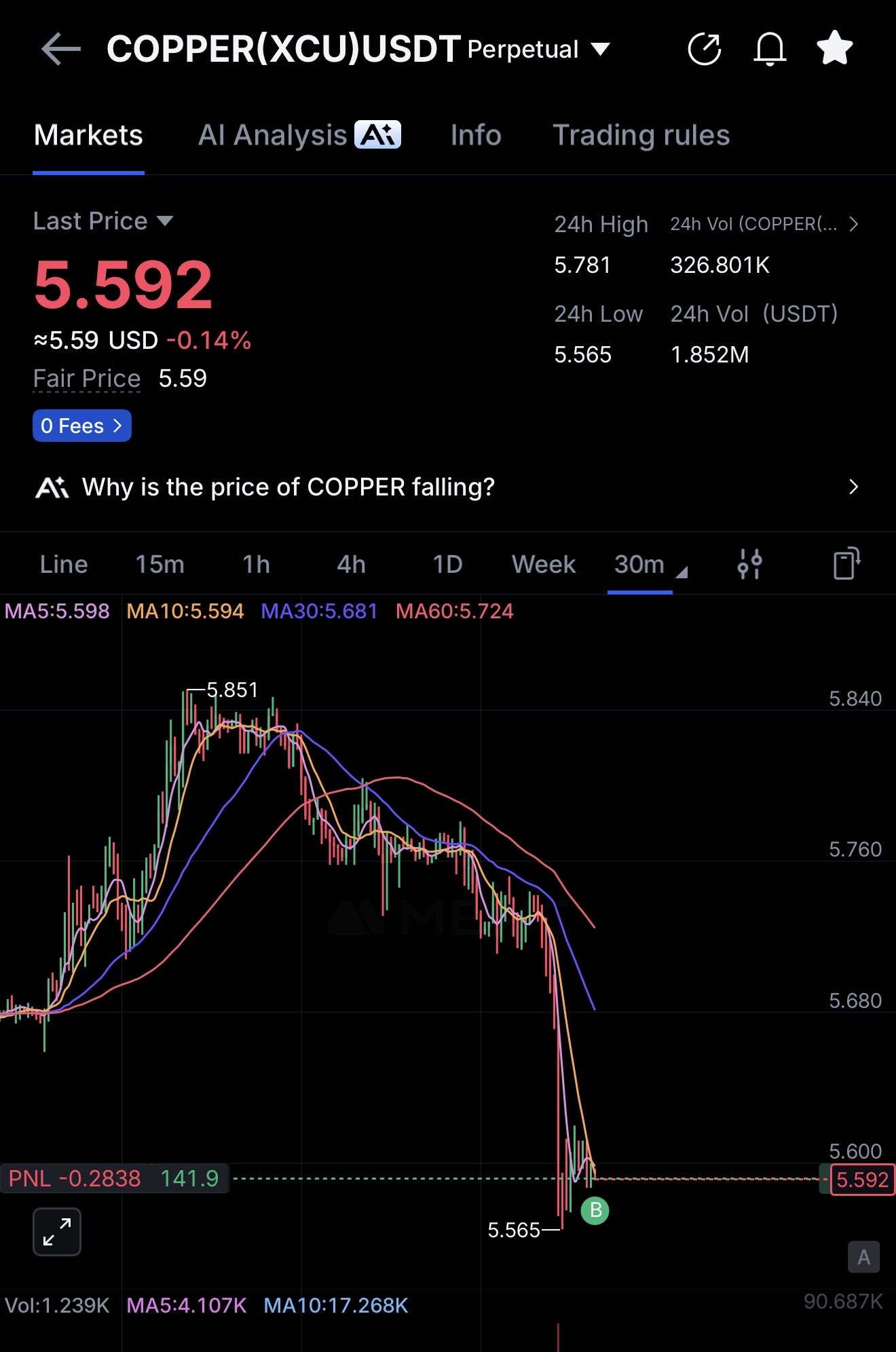 The author, seeking excitement, opened a long position on Copper (XCU) on-chain for the first time and is currently at a loss.