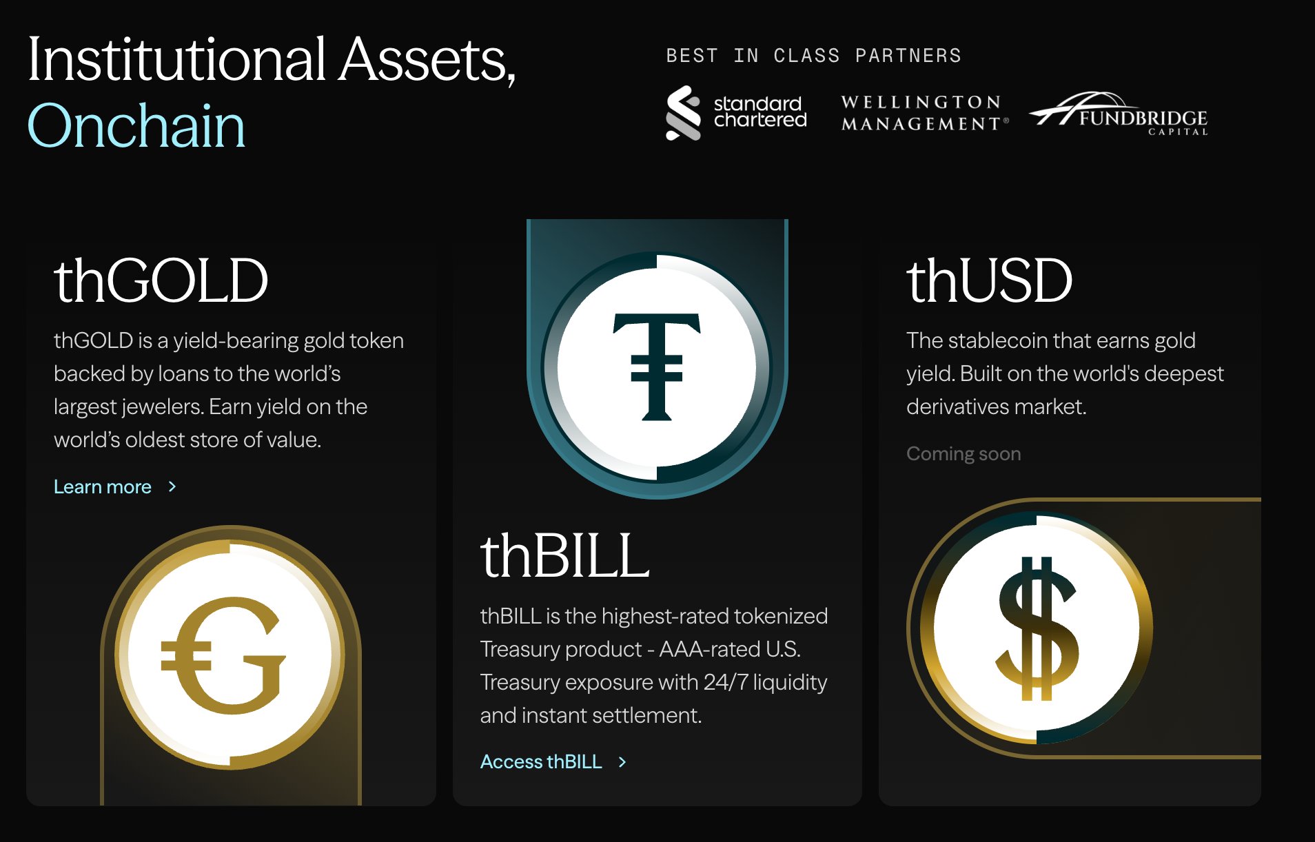 thUSD and thGOLD provide unique and stable returns through gold futures and lending, outperforming other stablecoins.