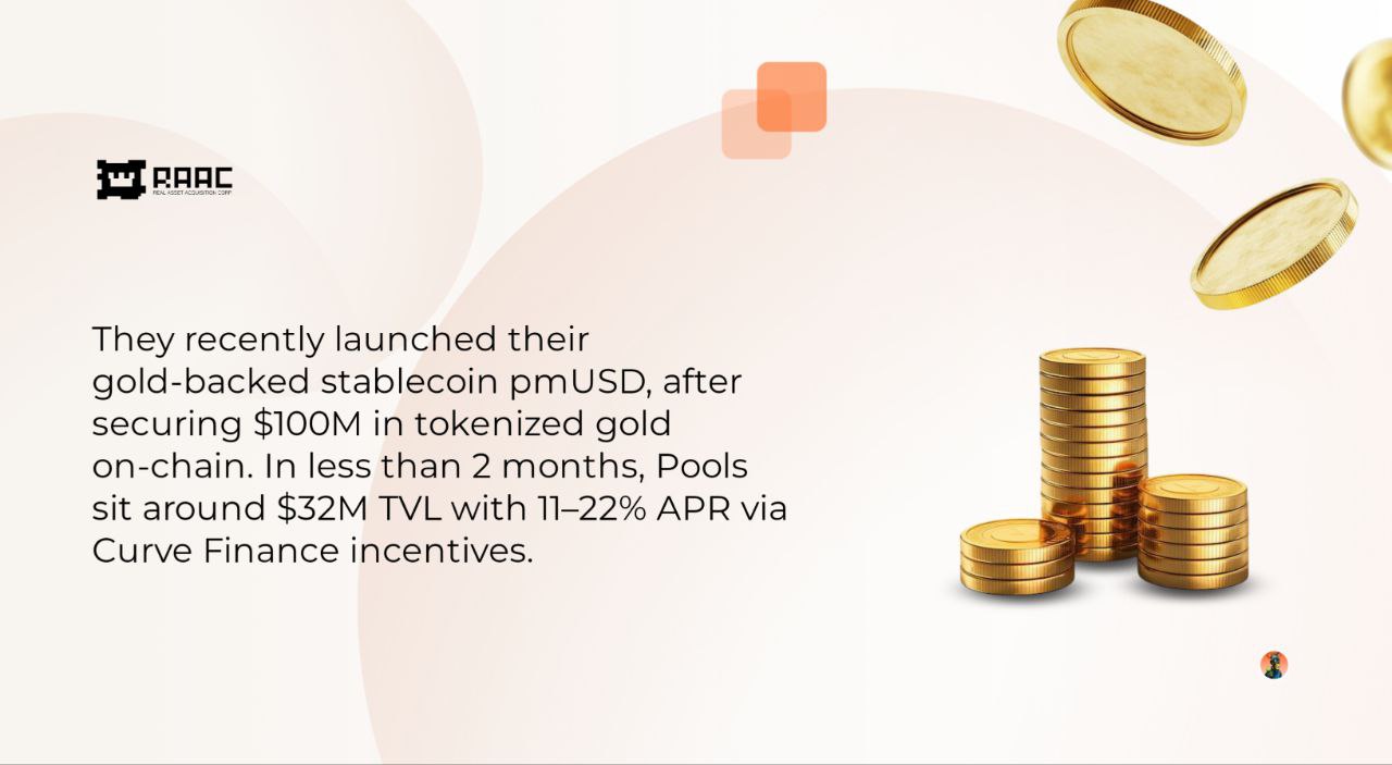 他们最近在链上获得价值1亿美元的代币化黄金后,推出了黄金支持的稳定币 pmUSD。