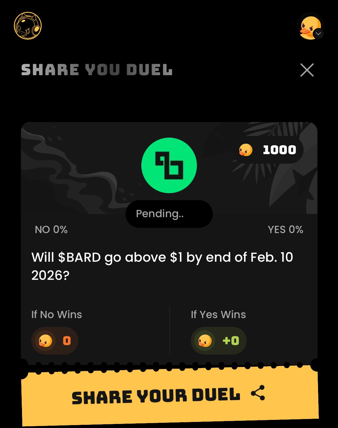 Mav🛸 Trader Influencer B5.66K @OG_Mavrickks11 hours to the end of @duel_duck season 2 mentionboard. my DD score has finally reflected but it’s a little late, I’ll be going all in for season 3 so wish me luck. also created a duel for the price of BARD, would love to know your predictions guys. the prediction market never dies and @duel_duck will be on top of it. get in on https://t.co/kjPeZ7AzmD good luck 🍀