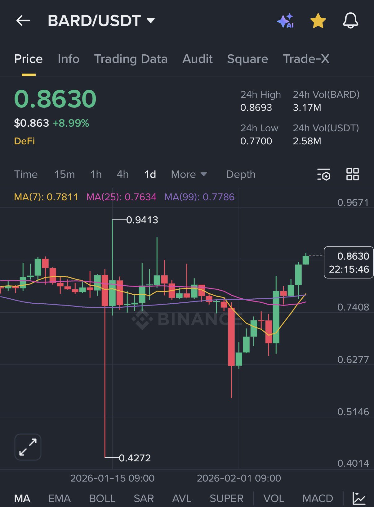 20 10 348 閱讀原文 >釋出後BARD走勢極度看漲BARD price rose by nearly 9% today, showing a strong rebound momentum, and the author’s sentiment is positive.