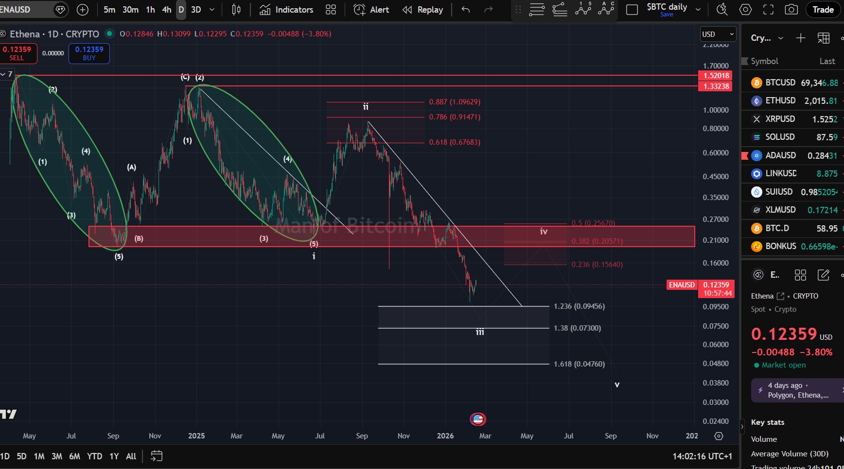 Man of Bitcoin ta analyst A8.86K @Manofbitcoin$ENA (request): My last update was some time ago. Price reacted to the wave-(ii) resistance zone and has since printed new bear market lows. As long as price remains below the trendline, I expect further downside extensions. A break above it would suggest that wave-(iv) has begun. Strong resistance sits between $0.20–$0.25.