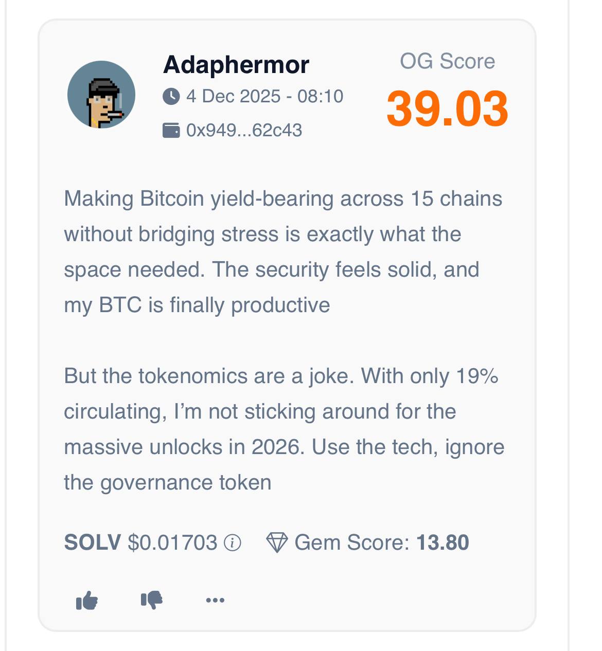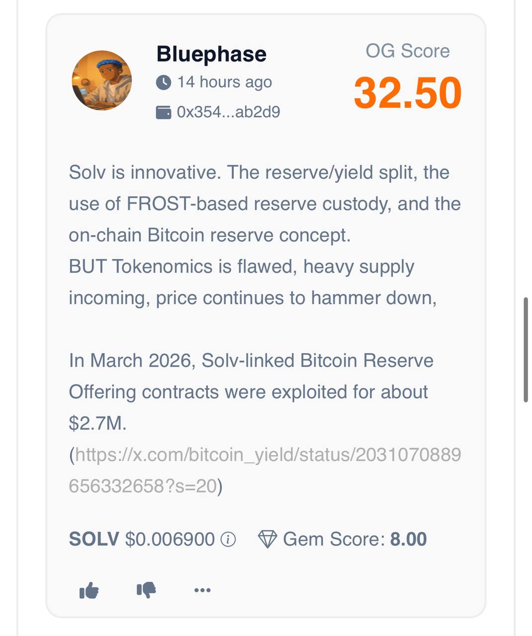 OGAudit🛡️Crypto Social Audits Researcher Tokenomics_Expert D22.67K @OGAuditSpotlighting our expert reviews on: @SolvProtocol Our OG expert auditors note that Solv Protocol $SOLV brings innovative Bitcoin yield infrastructure across multiple chains but concerns around tokenomics, low circulating supply and past exploits weigh on confidence. Can Solv’s technology drive real adoption or will token unlocks continue to undermine its value? More on the OG audit and the project info here⤵️ https://t.co/VzRmZJFxeu