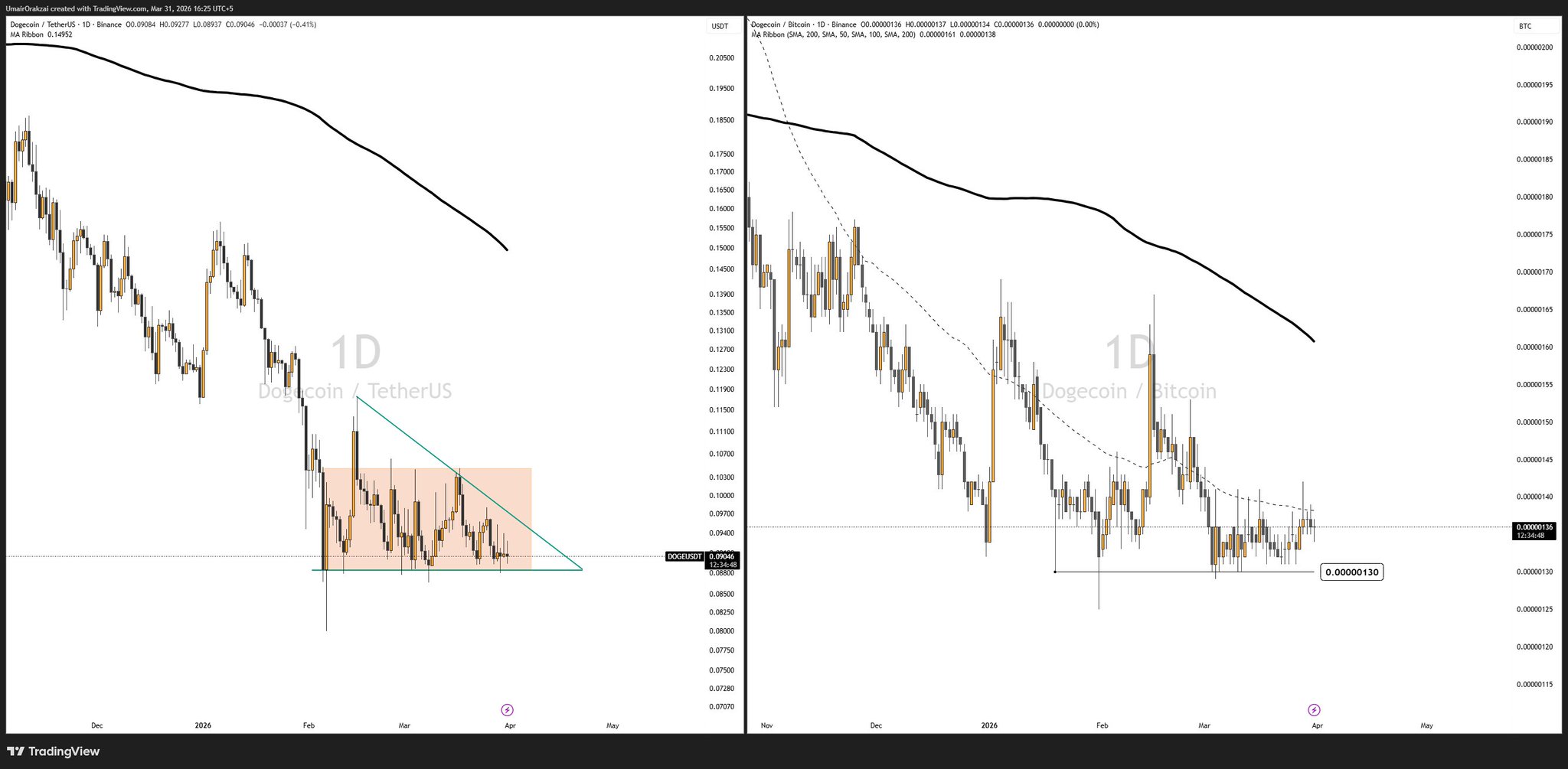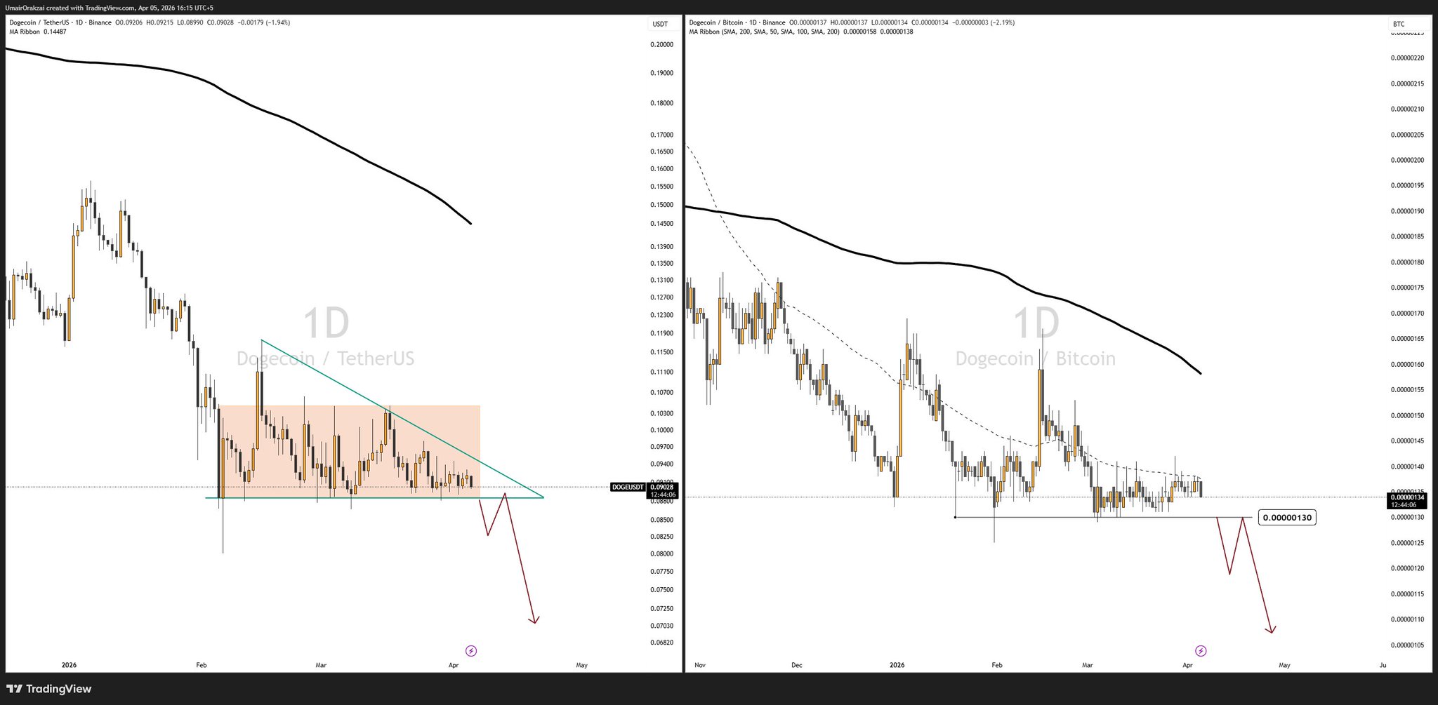 Plan is simple: DOGE/BTC needs a clean close below 130 points and a retest of that level. That's the entry trigger for the USDT pair short.